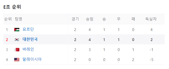한국은 요르단과 1승1무(승점 4)로 같은 성적을 기록 중이다.