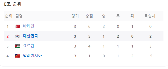 현재 E조는 요르단과 한국(이상 승점 4) 바레인(승점 3) 순으로 순위가 갈려 있습니다.
