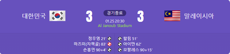 말레이시아에 극적인 동점골을 내주며 3-3 무승부로 경기를 마쳤습니다.